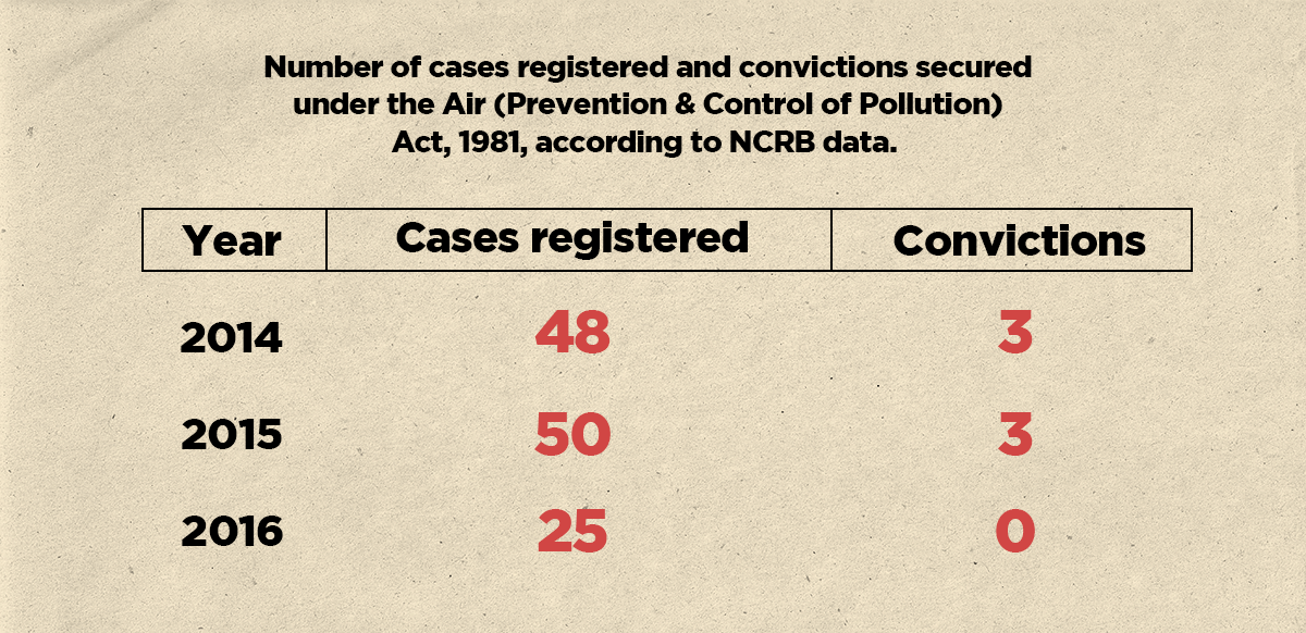 Even the number of cases registered is no better. According to the latest data from the National Crime Records Bureau (NCRB), no more than 25 cases were registered from across the country under the air pollution law in 2016.