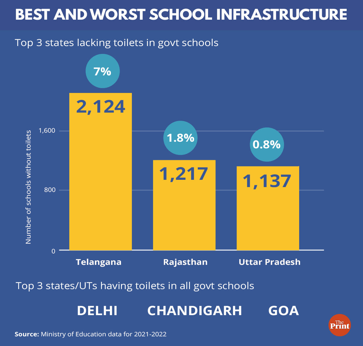 The state with the second poorest toilet infrastructure in India is Rajasthan, followed by Uttar Pradesh, but both fare much better than Telangana. Around 1.8 per cent of 68,948 schools in Rajasthan and 0.8 per cent of 1,37,024 schools in UP do not have toilets.