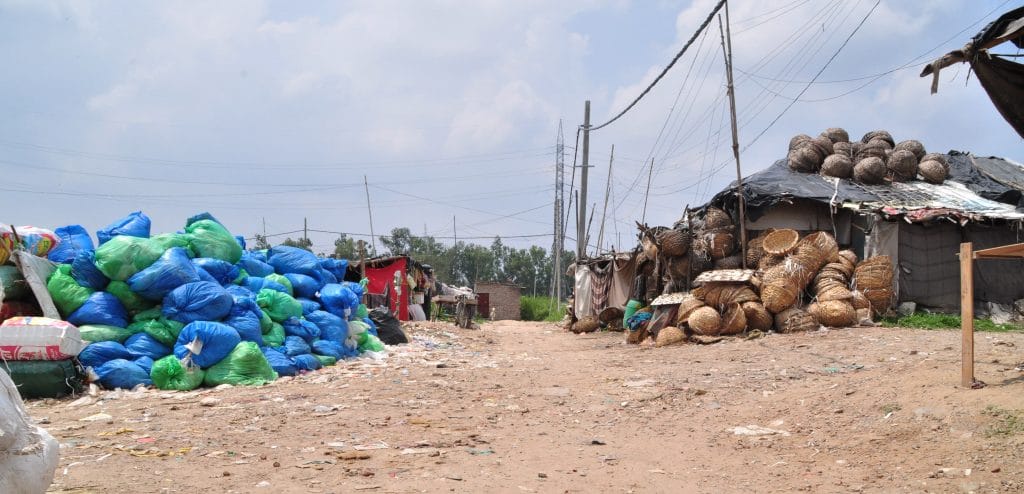 Further inside the camp, several large blue and green plastic bags can be spotted, piled on top of one another. These are full of waste, waiting to be segregated by the ragpickers who have settled inside.