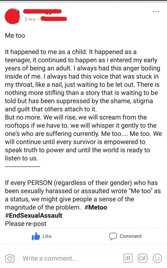 What started as a response on Twitter by American actress Alyssa Milano to the Harvey Weinstein scandal quickly turned into a movement of solidarity with women, and men, sharing their personal experiences of sexual assault and abuse on Facebook and Twitter.
