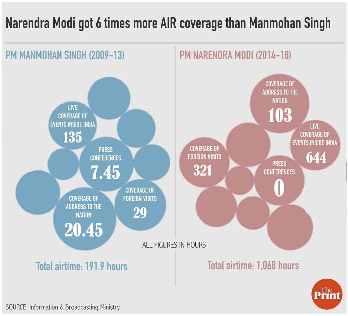 Data from the Ministry of Information & Broadcasting, which allocates a hefty budget to Doordarshan and AIR annually, shows that while Modi got over 1,068 hours of airtime on AIR between 2014 and 2018, Singh had received just 191.9 hours of it between 2009 and 2013, his second term as PM.