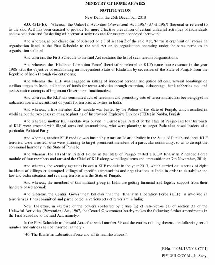“The Khalistan Liberation Force came into existence in the year 1986 with the objective of establishing an independent state of Khalistan by the secession of the state of Punjab from the Republic of India through violent means,” the notification said. “KLF has committed acts of terrorism and has been engaged in radicalisation and recruitment of youths for terrorist activities in India.”