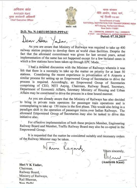 “Considering the recent experience in privatization of 6 Airports a similar process for setting up an Empowered Group of Secretaries to drive the process is required,” the letter addressed to Railway Board Chairman V.K. Yadav says.