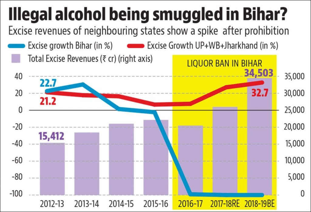 Anecdotal evidence on reports of alcohol being sold illegally in Bihar suggests that the latter possibility cannot be ruled out. This, if true, would also mean that prohibition has only led to the loss of revenue and not the bottle in Bihar.