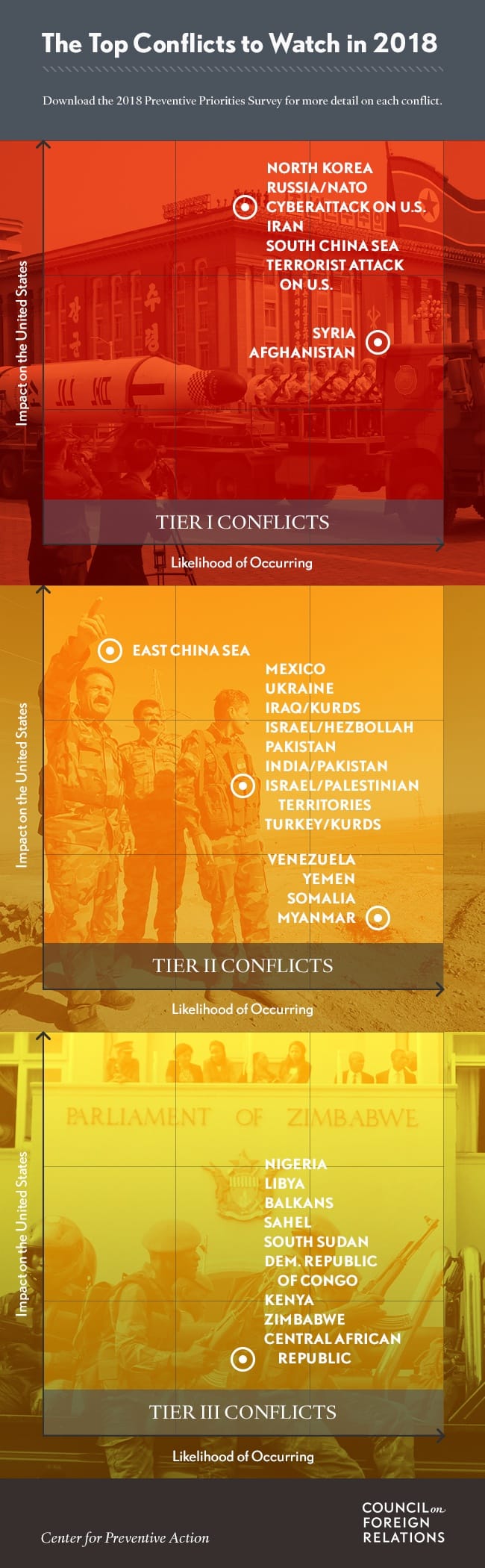 The survey, conducted by CFR’s Center for Preventive Action (CPA) asked foreign policy experts to rank thirty ongoing or potential conflicts based on their likelihood of occurring or escalating in 2018 and their potential impact on U.S. national interests.