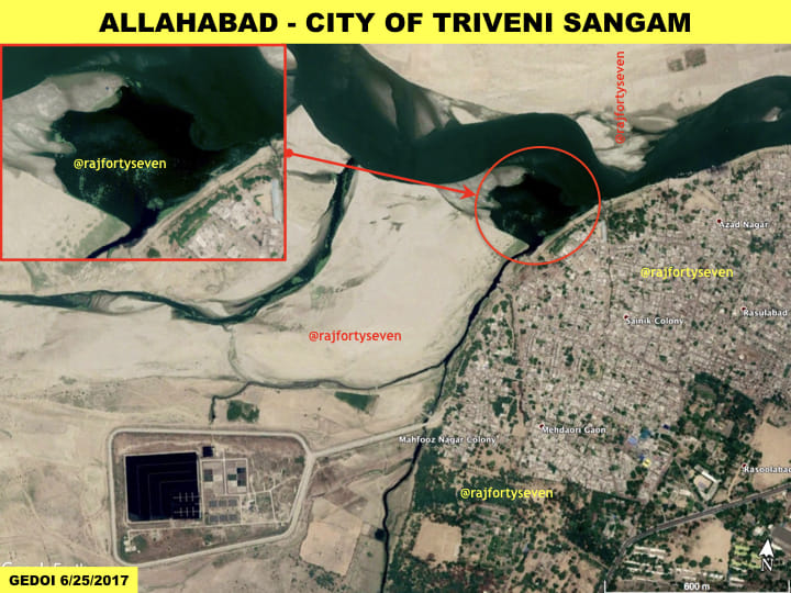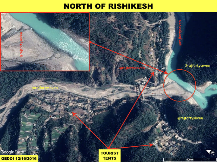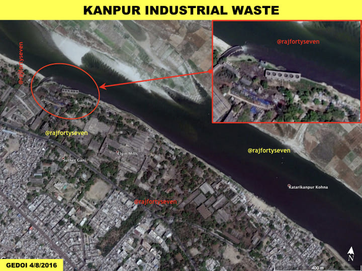The satellite images show the river is the cleanest at this point as it emerges out of the mountains, but a nala (drain) carrying waste joins the river near the north of the city.