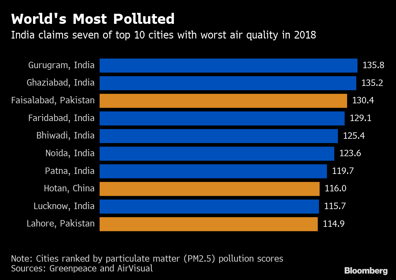 Gurugram, located southwest of India’s capital New Delhi, led all cities in pollution levels in 2018, even as its score improved from the previous year, according to data released by IQAir AirVisual and Greenpeace. Three other Indian cities joined Faisalabad, Pakistan, in the top five.
