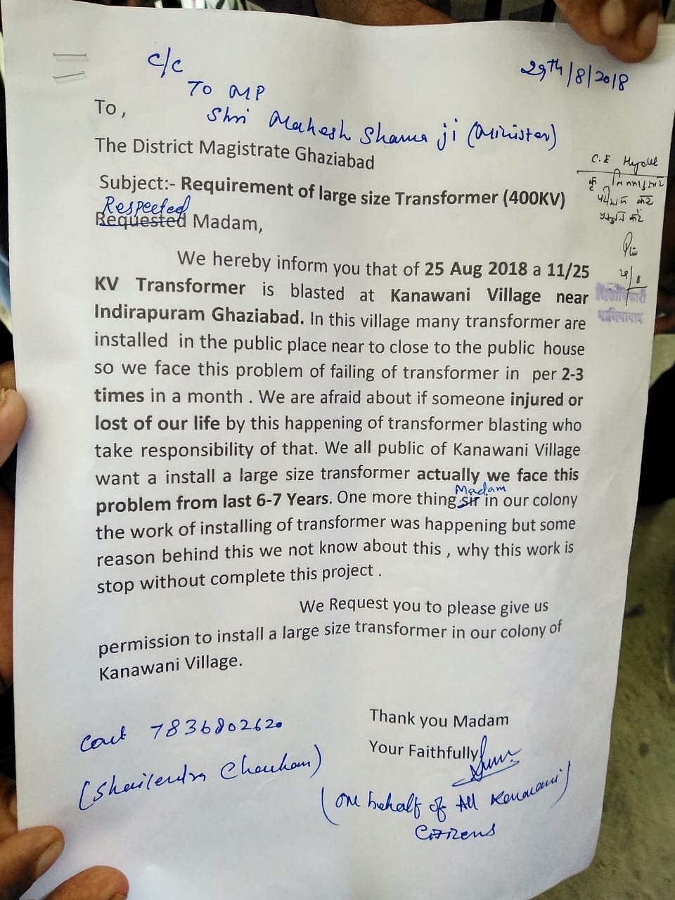 In a letter dated 29 August to the Ghaziabad district magistrate, the residents reiterated their demand for a 400 KV transformer.