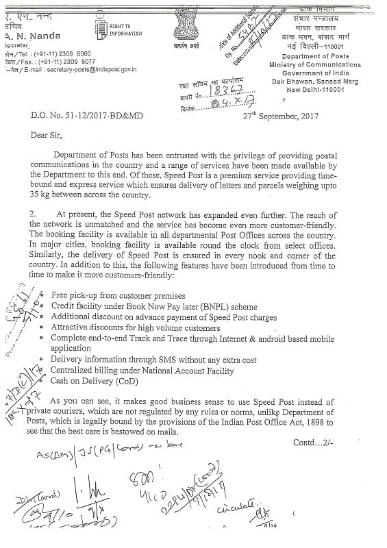 “It makes good business sense to use Speed Post instead of private couriers which are not regulated by any rules or norms unlike department of posts, which is legally bound by the provisions of the Indian Post Office Act 1898 to see that the best care is bestowed on mails,” the letter reads.