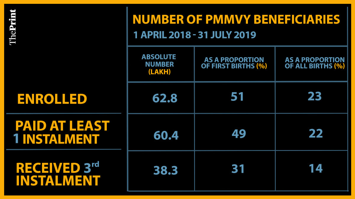 The ministry, led by BJP MP Smriti Irani, was replying to a query from ThePrint about a survey that claims the Pradhan Mantri Matru Vandana Yojana (PMMVY) only reached 49 per cent of its targeted beneficiaries between 1 April 2018 and 31 July 2019.
