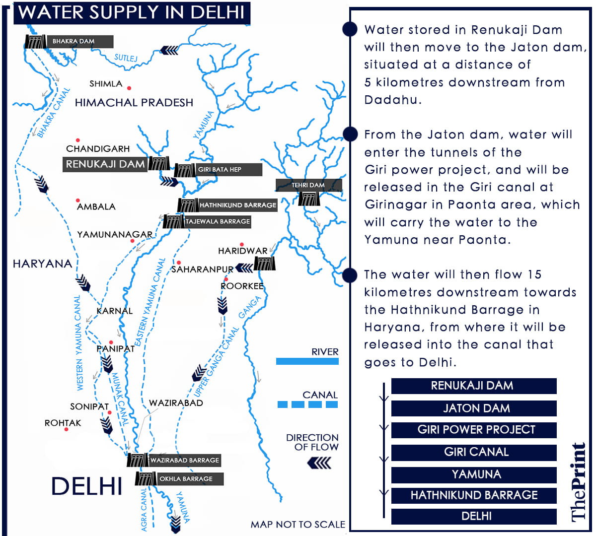 The the 148-metre-high rock-filled structure will be able to store 498 million cubic metres of water in its reservoir. The stored water of the Renukaji dam will be channelled to Delhi-NCR, UP and Haryana from the Hathnikund Barrage, to Delhi-NCR again from the Wazirabad Barrage, and to UP, Haryana and Rajasthan from the Okhla Barrage.