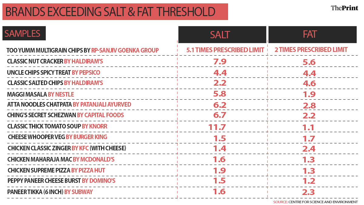 In the noodles category, Nestle’s Maggi contained salt 5.8 times more than the limit while Atta Noodles by Patanjali had salt 6.2 times the FSSAI threshold.