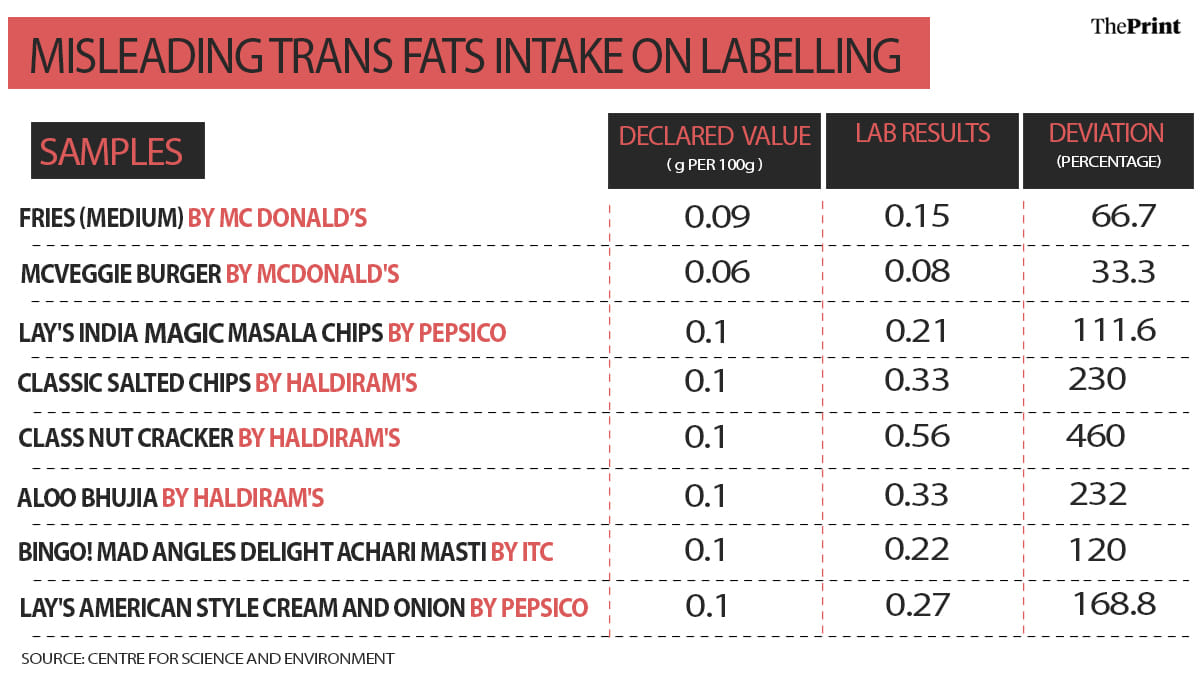The study has also accused the industry of misleading consumers by downplaying the exact amount of trans fats in their products. It found that in some samples, the actual fats levels were 50 times than that declared on the food packets.