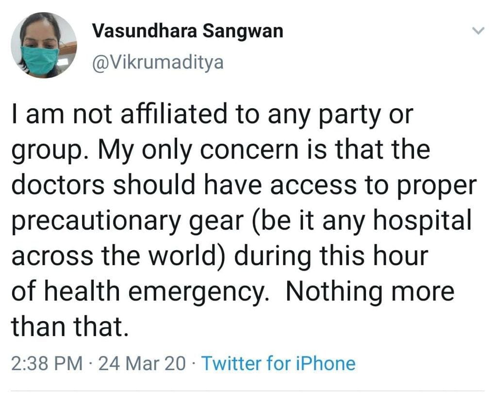 A day after Dr Kakkar tweeted, another account under the name of Dr Vasundhara Sangwan began posting about the lack of masks. According to the user’s Twitter bio, Dr Sangwan is studying for her Masters in Medicine in Jaipur.