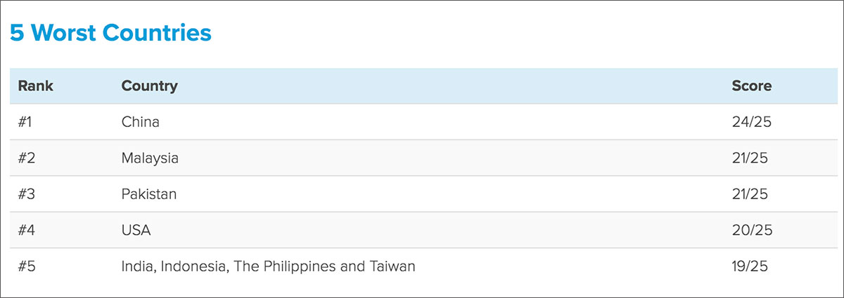 China tops list with 24/25 score