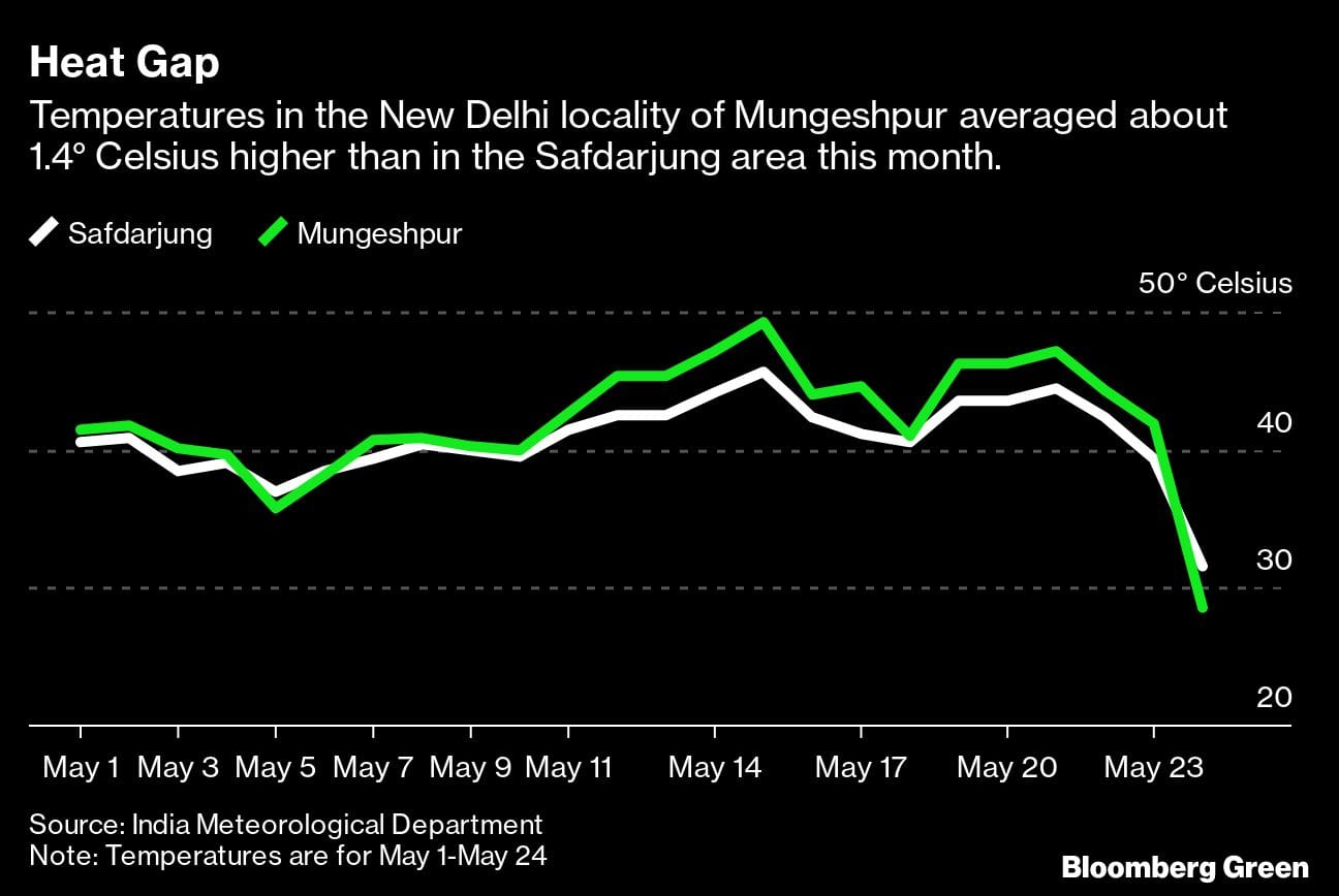 Temperatures in the gritty New Delhi locality of Mungeshpur averaged 1.4° Celsius higher so far this month than in the suburban enclave of Safdarjung, data from the India Meteorological Department shows. Many factors can drive temperature variance between neighborhoods including wind patterns, but the presence or absence of healthy vegetation also plays a key role.
