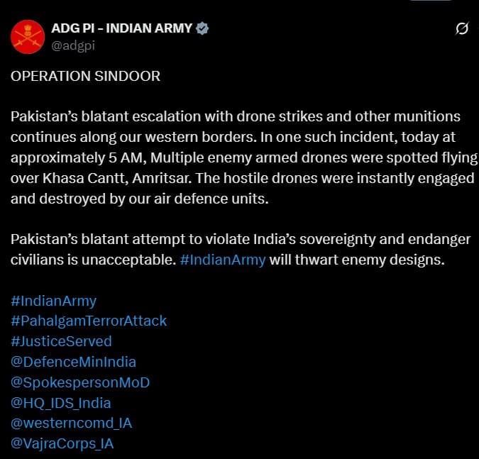 “Multiple armed drones have been sent through the night, endangering civilians and religious sites. The Indian Armed Forces remain vigilant and are committed to defending the sovereignty of the nation,” the post stated.