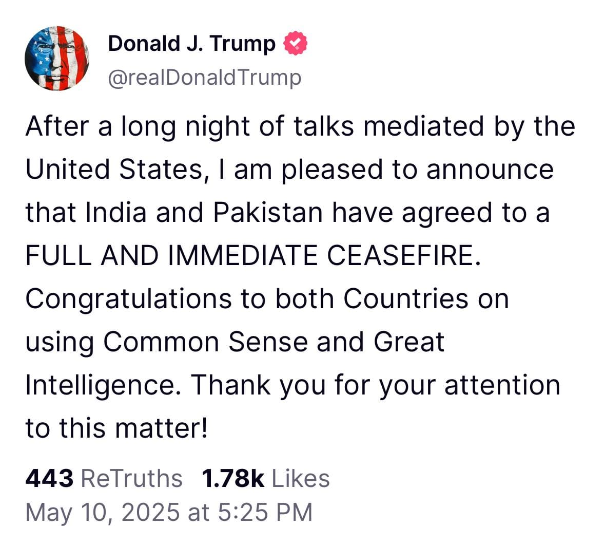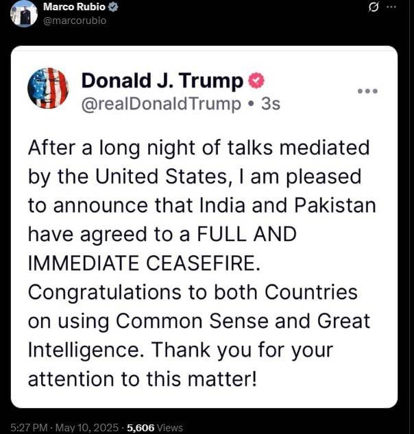 5.25 pm: US President Donald Trump, in a post on social media platform Truth Social, says “After a long night of talks mediated by the United States, I am pleased to announce that India and Pakistan have agreed to a FULL AND IMMEDIATE CEASEFIRE. Congratulations to both Countries on using Common Sense and Great Intelligence. Thank you for your attention to this matter!”