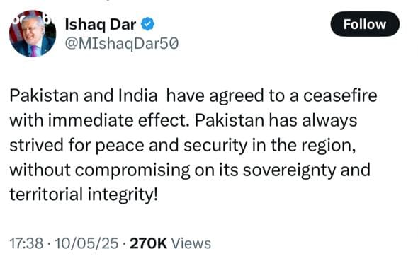 “Pakistan and India have agreed to a ceasefire with immediate effect,” posts Pakistan Foreign Minister Ishaq Dar on X. “Pakistan has always strived for peace and security in the region, without compromising on its sovereignty and territorial integrity!”