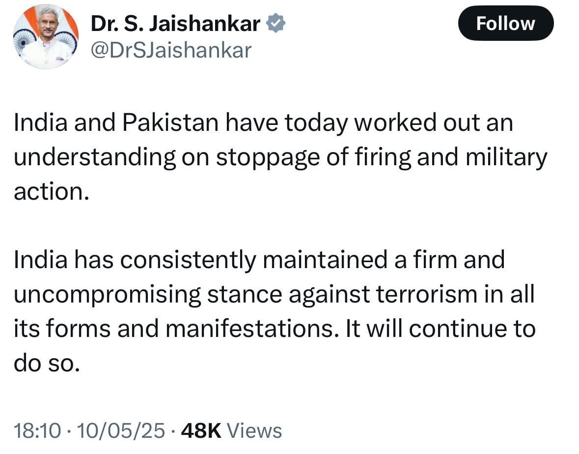 6.15 pm: S. Jaishankar, too, posted on X: “India and Pakistan have today worked out an understanding on stoppage of firing and military action. India has consistently maintained a firm and uncompromising stance against terrorism in all its forms and manifestations. It will continue to do so.”
