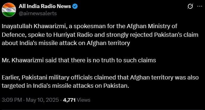 Khawarizmi said that there is no truth to such claims. Pakistani military officials had earlier claimed Afghan territory was targeted by India–a claim slammed by Vikram Misri as “ludicrous and frivolous”.