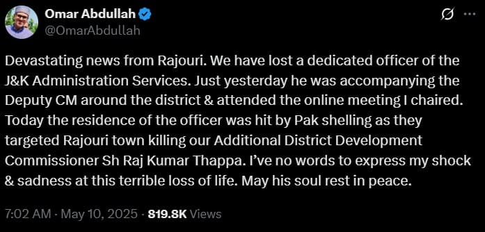 8.15 am: Jammu and Kashmir CM Omar Abdullah tweeted about the death of a district official in cross-border shelling in Rajouri.