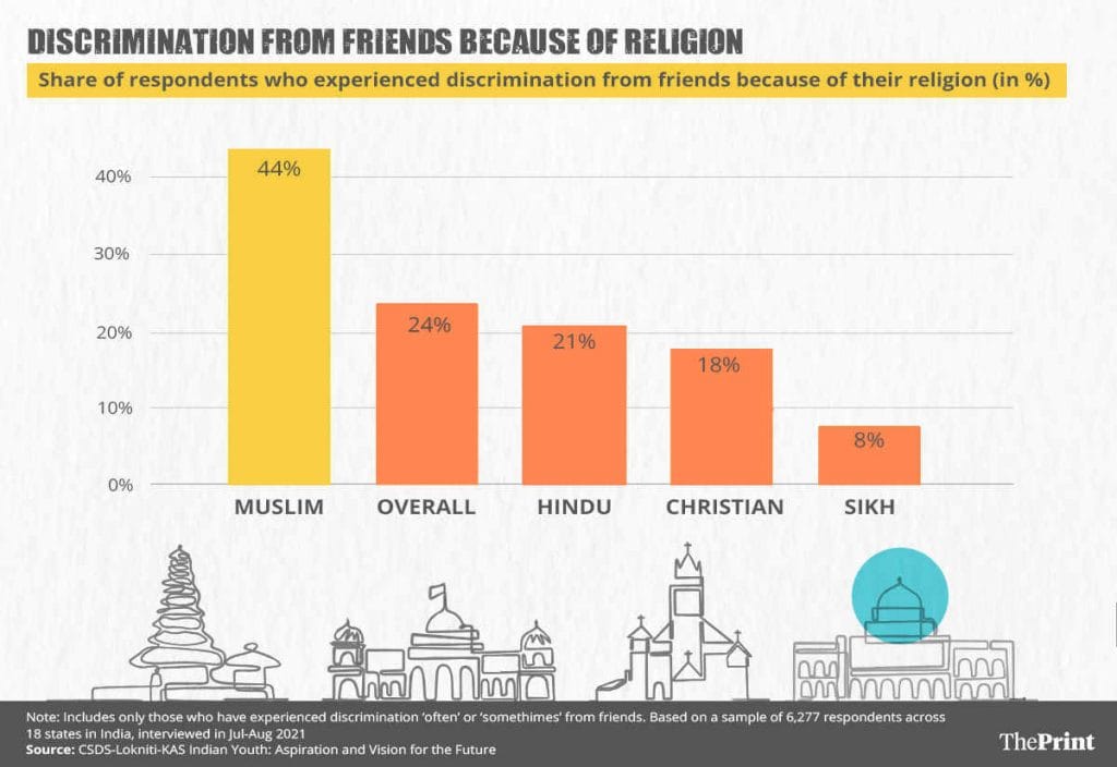 About 44 per cent of Muslim respondents said they faced discrimination from their friends, with 13 per cent saying this happened often and 31 per cent saying it occurred sometimes. Only 18 per cent Christians (4 per cent often, 14 per cent sometimes) and 8 per cent Sikhs (3 per cent often, 5 per cent sometimes) reported such discrimination, the survey data showed.