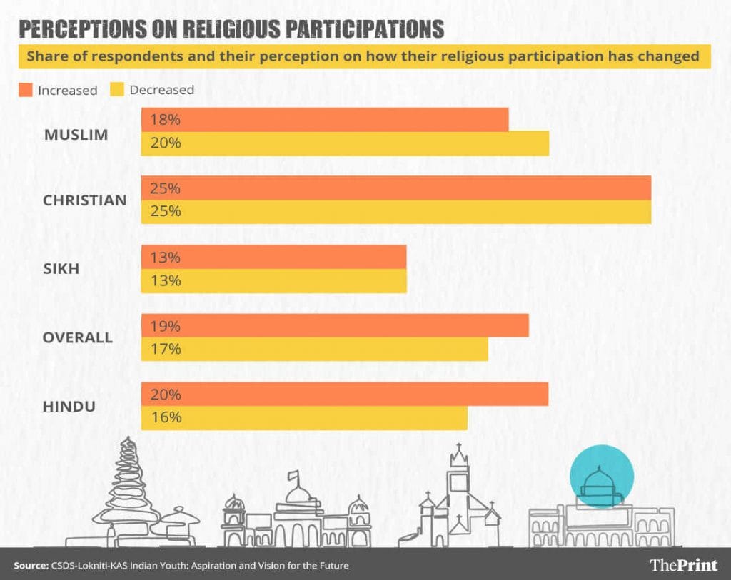 While 18 per cent of Muslim youngsters observed an increase in their religious participation, 20 per cent felt that their religious participation had gone down.