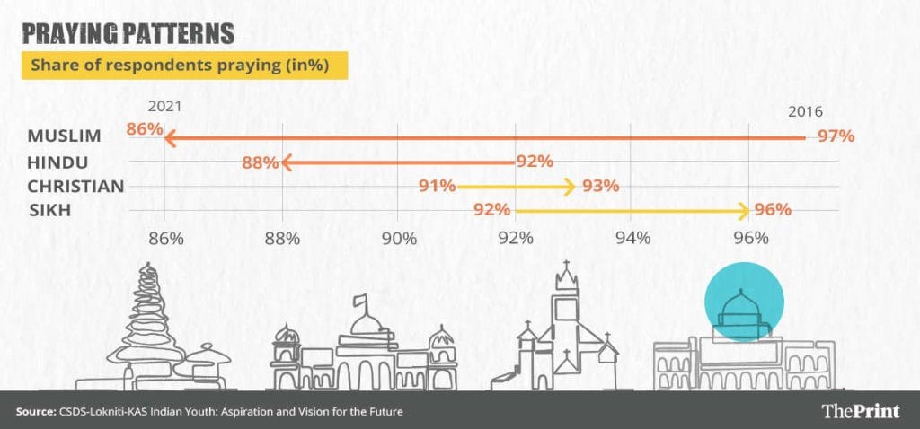 The 2016 CSDS youth survey, conducted on a sample size of 5,681, found that Muslim youths reported higher religiosity than any other group. In that year, 97 per cent of Muslim respondents said they prayed regularly, followed by Hindus (92 per cent), Sikhs (92 per cent), and Christians (91 per cent).