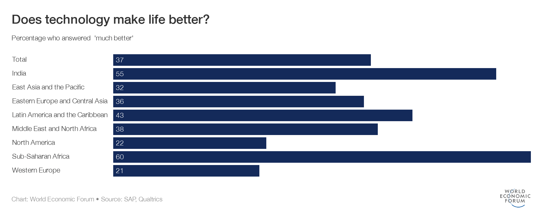 Over 55 per cent Indian respondents said technology has made their lives better, while only 22 per cent of Western Europeans felt the same. On the other hand, 60 per cent of those from Sub-Saharan Africa felt new technologies had enhanced their “personal relationships”, “society” and “jobs”.