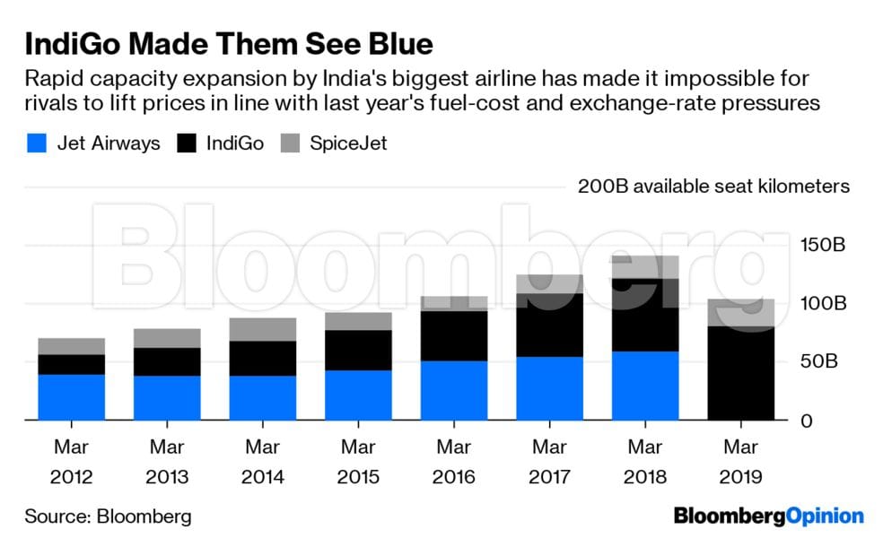 Investors were just starting to enjoy the fruits of a frenetic expansion that saw the no-frills carrier, Asia’s largest, double its capacity in the three years through March. Full-cost rival Jet Airways India Ltd. tried to keep up, until it was forced to ground its last plane in April under a truckload of debt. Meanwhile, InterGlobe has put together a cash war chest — net of debt — of nearly $2 billion.
