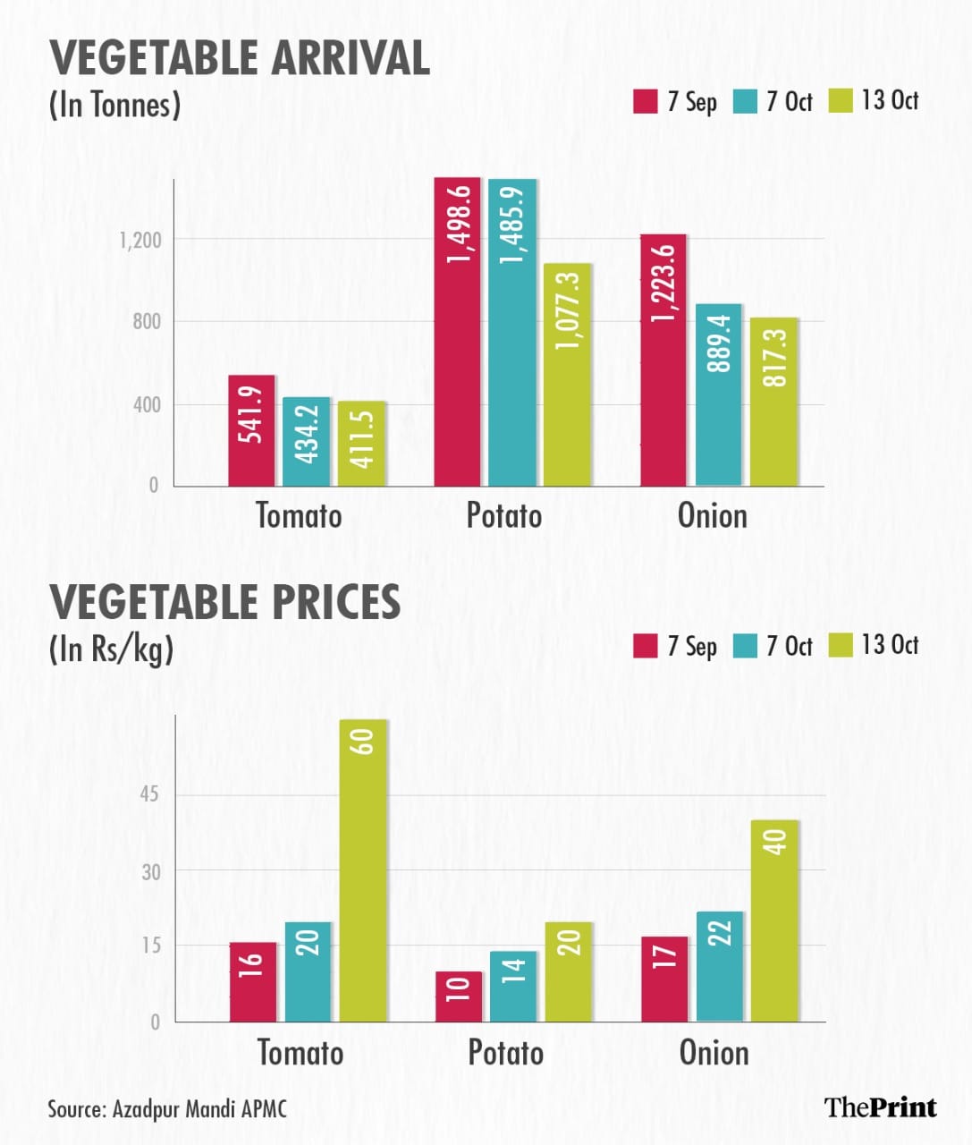 “However, the prices have not surged as much as those of tomatoes due to suppressed demand during Navratri,” he added, citing the Navratri tradition observed by many whereby they abstain from non-vegetarian food as well as onions and garlic.