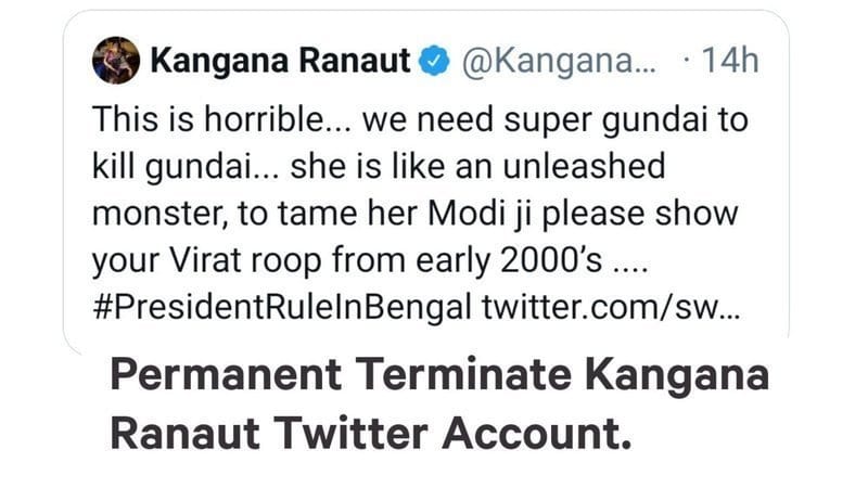 New Delhi: Actor Kangana Ranaut’s Twitter account was permanently suspended Tuesday, following her remarks on the post-poll violence in West Bengal. In a tweet Monday, the actor called upon Prime Minister Narendra Modi to use his “Viraat roop” from the early 2000’s to “tame” Chief Minister Mamata Banerjee.