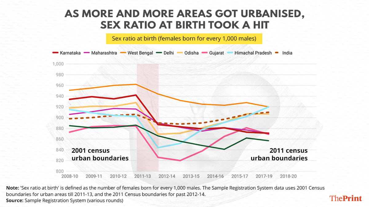 “The SRS used the population metrics using the 2001 frame till 2013 and the 2011 Census after that period. Why this matters is because this defines the boundaries of urban versus rural areas. Our research showed that increasing urban class size corresponded to a higher preference for sons, implying bigger cities having a skewed SRB, hence, the SRB deterioration. So far, we know that rural areas generally have better sex ratio than urban areas. Preference for small family size in urban areas with at least one son may be one of the factors behind declining sex ratio at birth,” Debolina Kundu of Delhi-based National Institute of Urban Affairs told ThePrint.