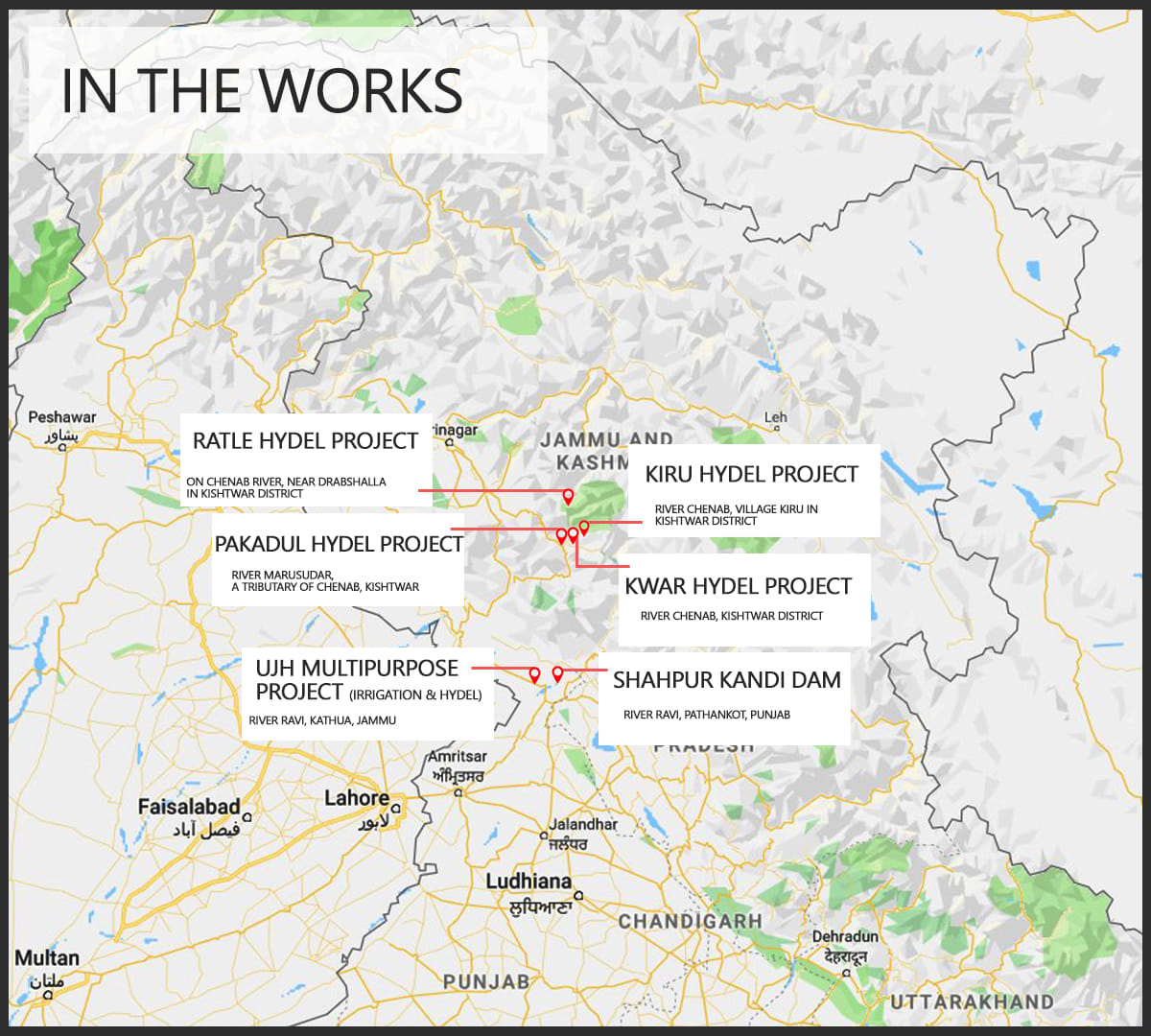 The six projects include four hydropower plants — 850 MW Ratle, 1,000 MW Pakadul, 624 MW Kiru and 540 MW Kwar — on the Chenab.