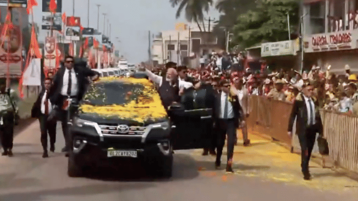 Udupi: Prime Minister Narendra Modi on Friday held a roadshow in Udupi in Karnataka ahead of the Laksha Kantha Gita Parayana programme.