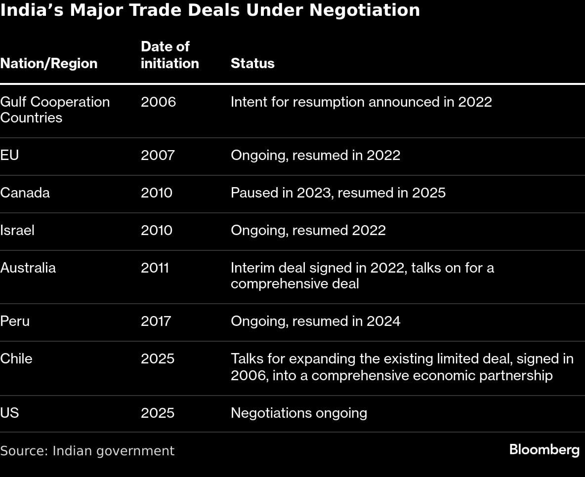 The agreement is the third free-trade pact New Delhi has concluded this year as it seeks to shed a protectionist image by lowering trade and non-trade barriers long bemoaned by investors. The push has taken on greater urgency after US President Donald Trump imposed 50% tariffs on Indian goods — the highest in Asia — squeezing exporters in labor-intensive sectors.