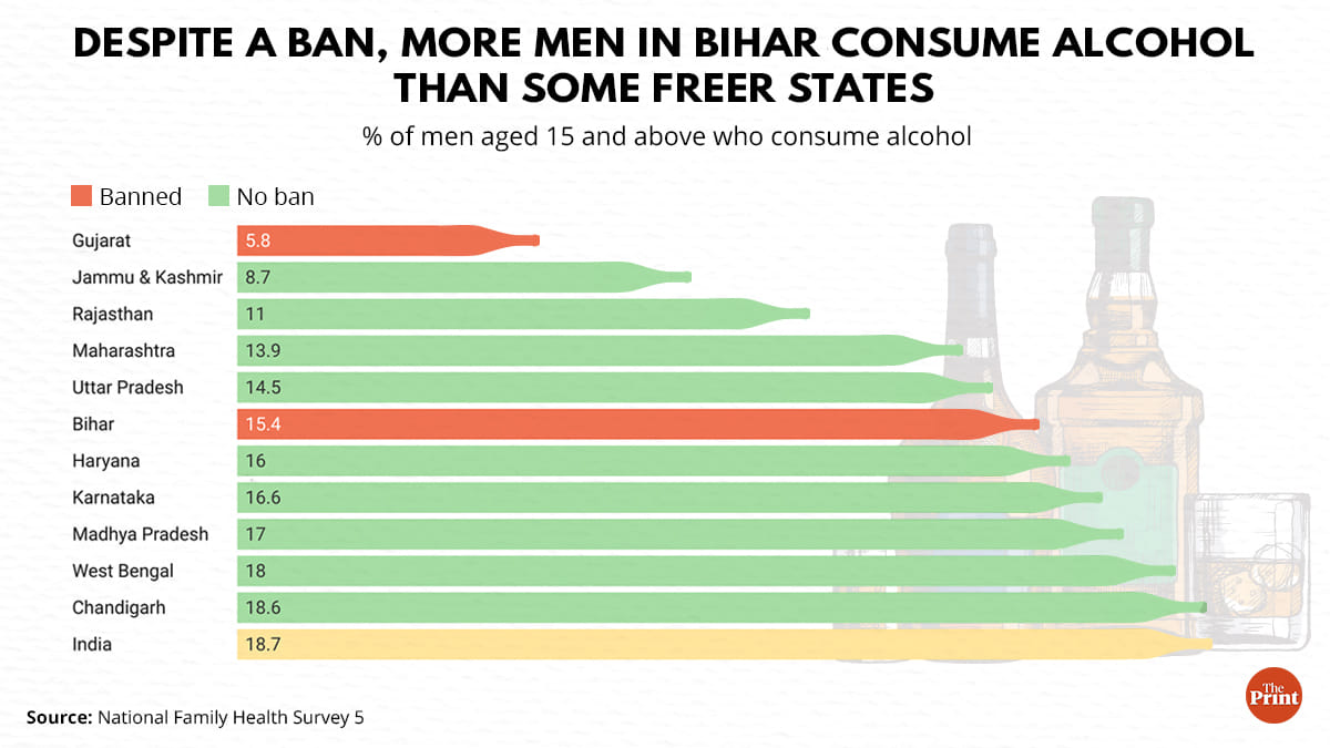 Only in Gujarat where alcohol is restricted, do 6 per cent men consume the hard drinks, but it still offers liquor in special economic zones, licensed operators, non-domiciles etc., unlike Bihar.