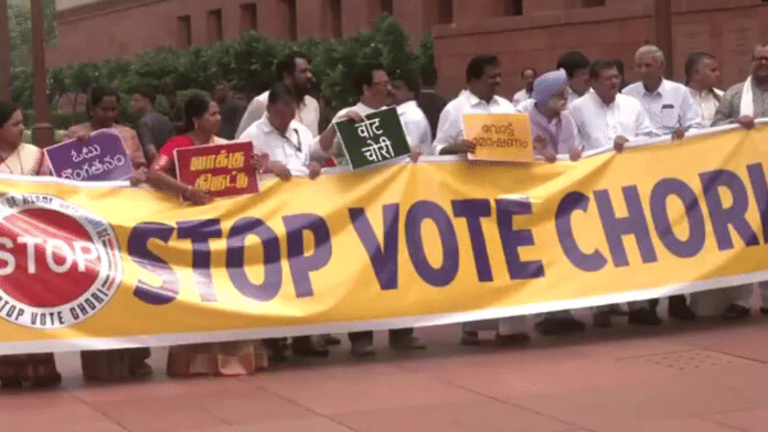 They also held a big banner that read “vote chori” and held posters demanding “stop SIR”.