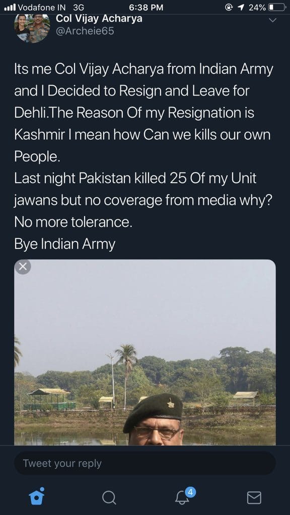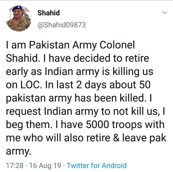 Using the same disinformation style as seen in the first tweet, a satirical tweet posted by ‘Colonel Shahid’ claimed, “I am a Pakistan Army Colonel. I have decided to retire early as Indian army is killing us on LOC. In last two days about 50 pakistan army has been killed. I request Indian army not to kill us, I beg them. I have 5000 troops with me who will also retire & leave pak army (sic).”