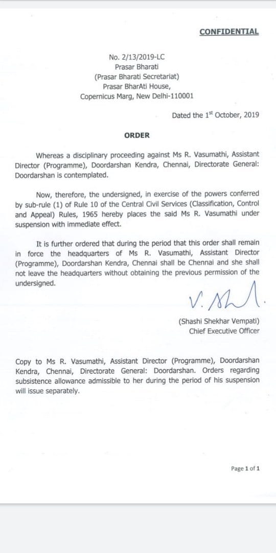 Vasumathi has been placed under suspension under the Central Civil Services (Classification, Control and Appeal) Rules, 1965. The order has been signed by the Chief Executive Officer (CEO) of Prasar Bharathi Shashi Shekhar Vempati.