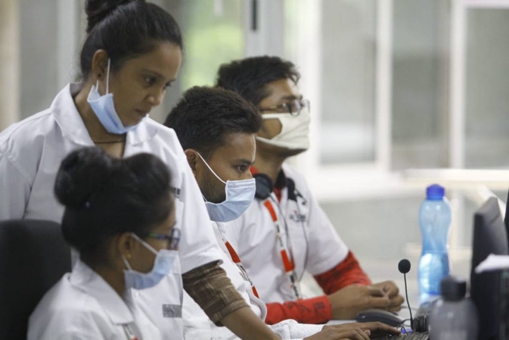 After dialling the helpline 104, which was launched on 1 June, a van consisting of a doctor and a paramedic arrives at the site to perform an antigen test. Prior to the test, the patient is thermally screened and a pulse oximeter is used to measure oxygen saturation levels.