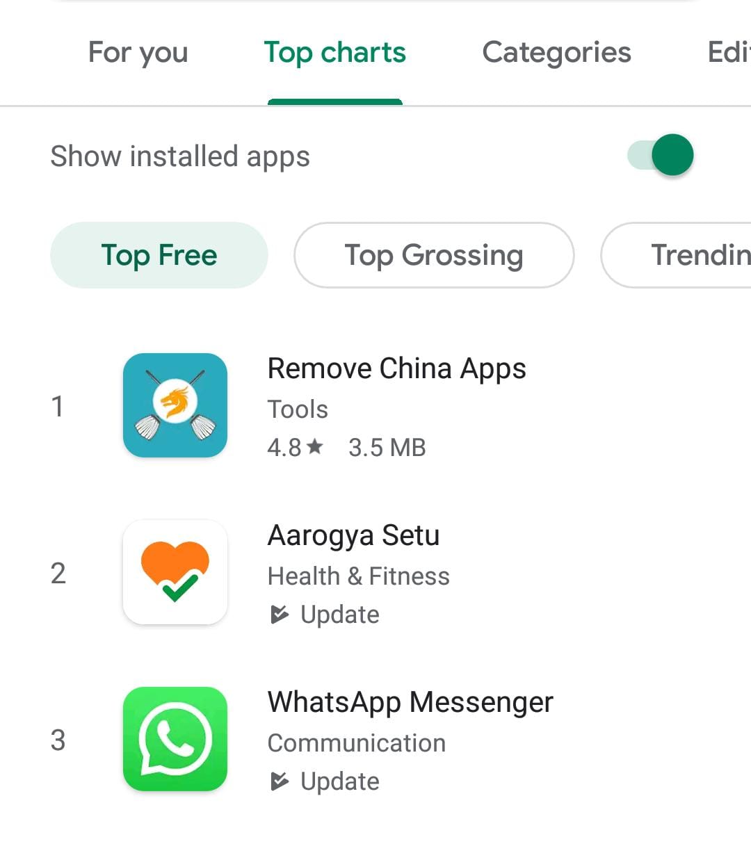 New Delhi: The ‘Remove China Apps’ — an app that identifies Chinese applications in phones for the users to remove them — is topping the charts of Google Play Store in the category of ‘top free’ Monday.