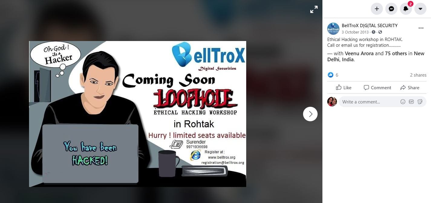 Mehra’s name does appear in an old 2013 Facebook post promoting BellTroX’s ethical hacking workshop. However, Mehra told ThePrint it was not a “hacking workshop”, but an “internet security workshop”.