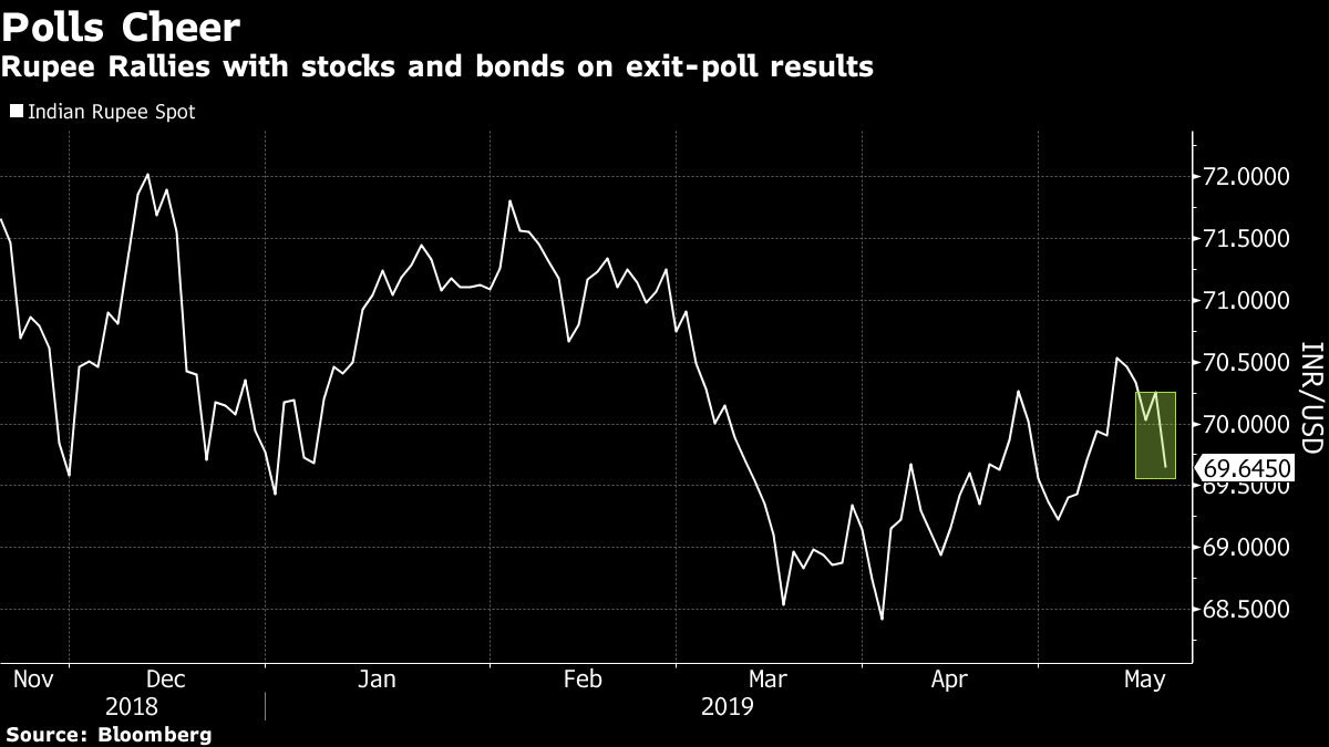The S&P BSE Sensex climbed as much as 2.6%, the biggest advance since March 2016, and a gauge of volatility collapsed as exit polls predicted a comfortable majority for the Bharatiya Janata Party and its allies. The rupee rose the most since December, while the yield on benchmark 2029 bonds slid 6 basis points.