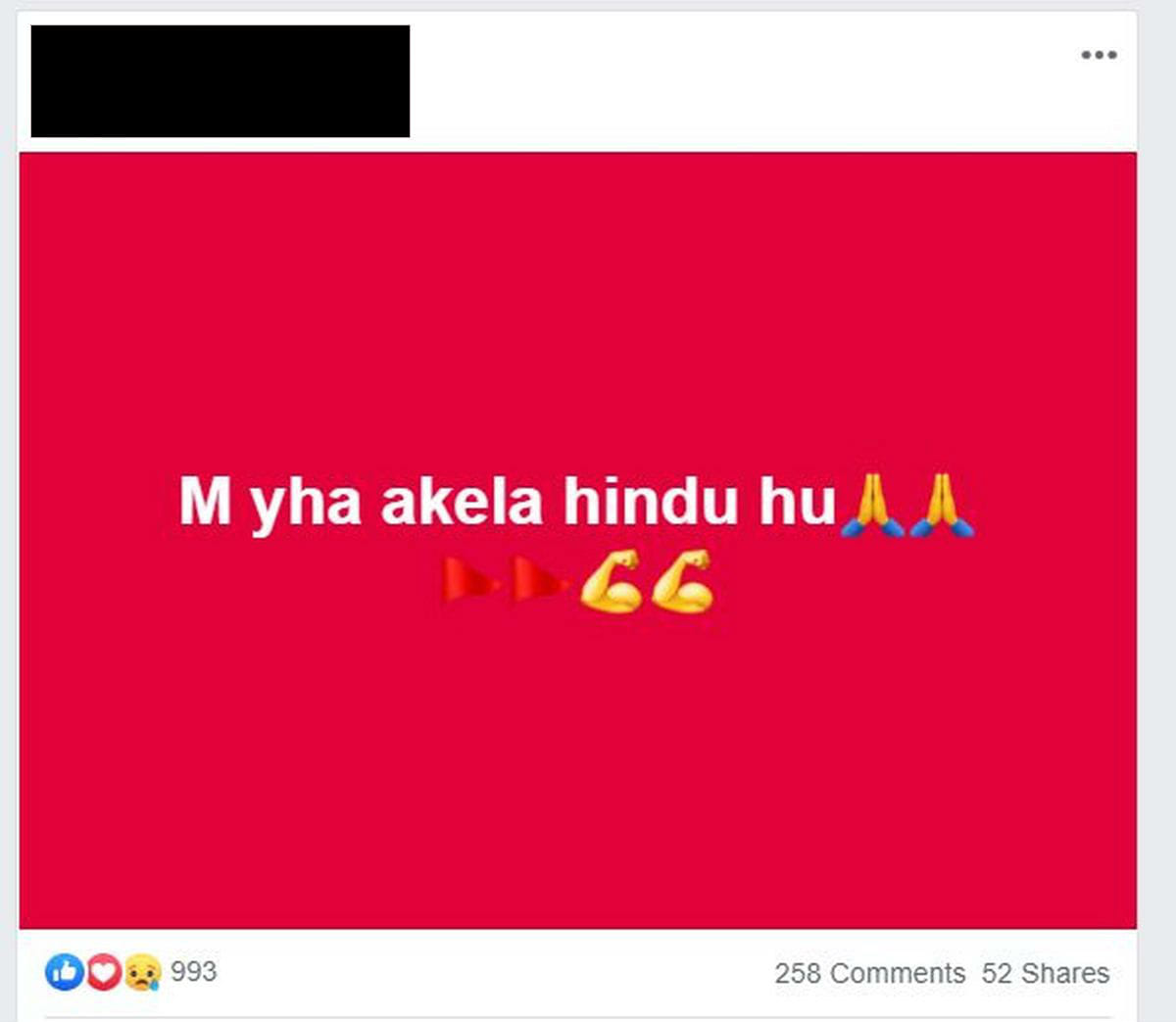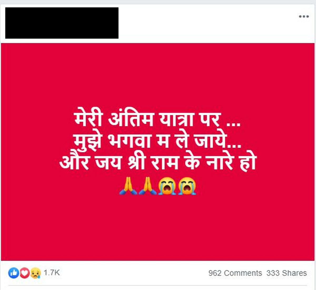 His bio on Facebook says “[name] naam hai mera, bio main itna kafi hai, baki samay ane par. Jai Shree Ram ([name] is my name. This much is sufficient in the bio. Rest when the time comes. Jai Shree Ram).”
