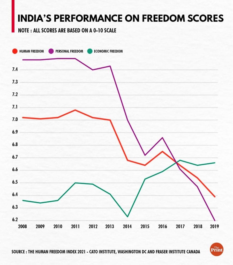 Between 2013 and 2019, India’s rank on the personal freedom index has slipped to 119 from 85.