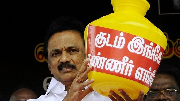 Joining the DMK workers at the protest, Stalin dramatically raised an empty pot and asked, “Kudam Inge Kudineer Enge?” (Pot is here, where is the drinking water)?”