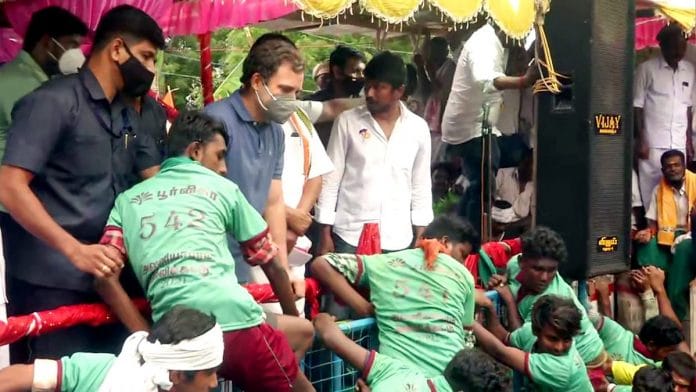 Madurai: Congress leader Rahul Gandhi on Thursday witnessed the popular bull taming sport jallikattu at Avaniapuram here, saying his visit was aimed at sending out a message to “those who think they can run roughshod on Tamil people.”