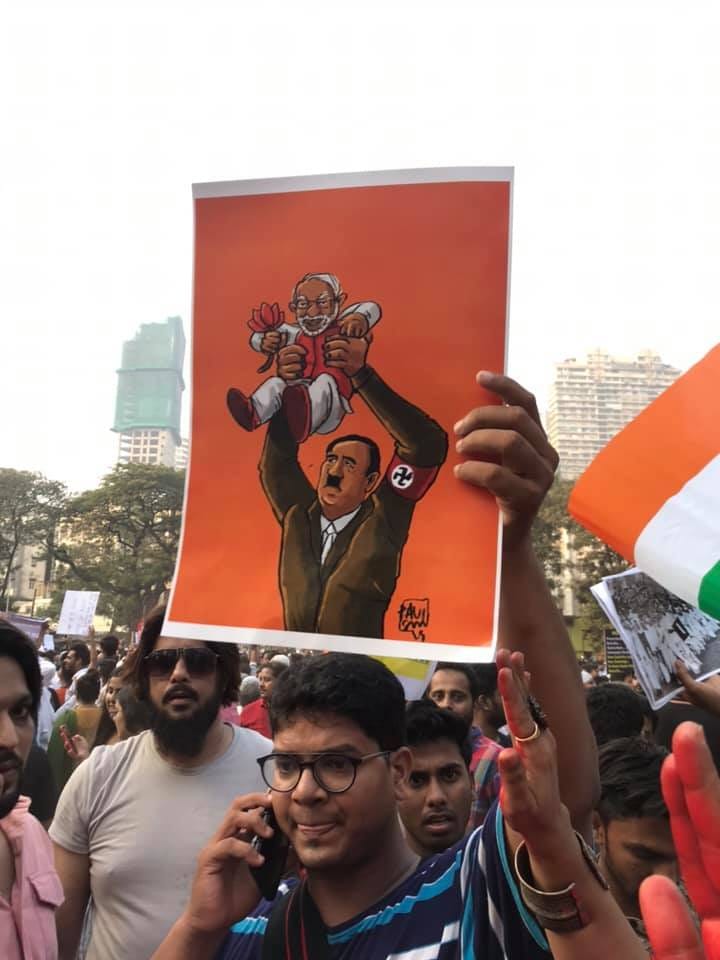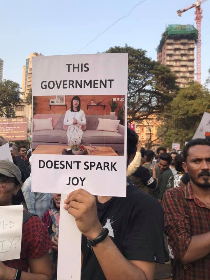 In Mumbai, where an estimated 25,000 people flocked to Tardeo’s August Kranti Maidan and the roads near it, one protester riffed on Marie Kondo’s method of decluttering one’s life with a sign that read “THIS GOVERNMENT DOES NOT SPARK JOY”, while another, clearly a fan of Disney’s The Lion King, held up a placard that immediately brings to mind that movie’s iconic scene, but with a German twist.